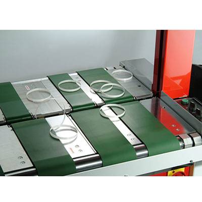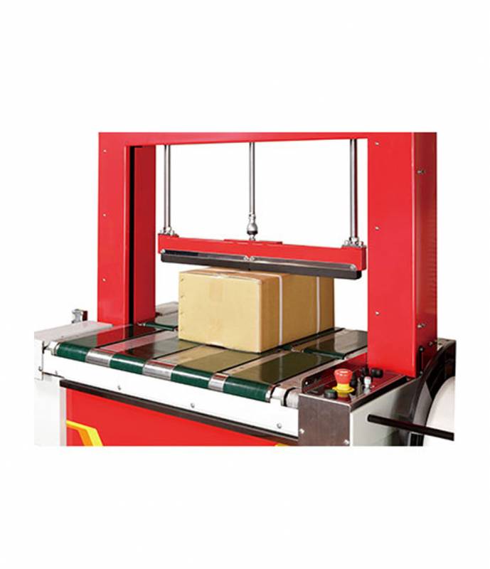 Dispone de una mesa de bandas transportadoras para controlar el avance del bulto a flejar y de una prensa neumática.