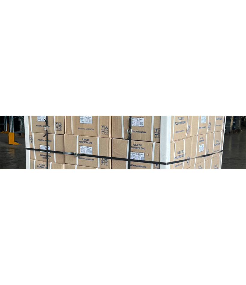 Gracias a su diseño, las hebillas de alambre cruzadas permiten el deslizamiento en un solo sentido, brindando un flejado de alta tensión sin deformaciones.